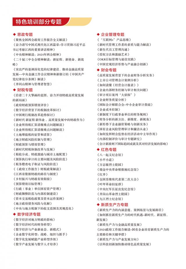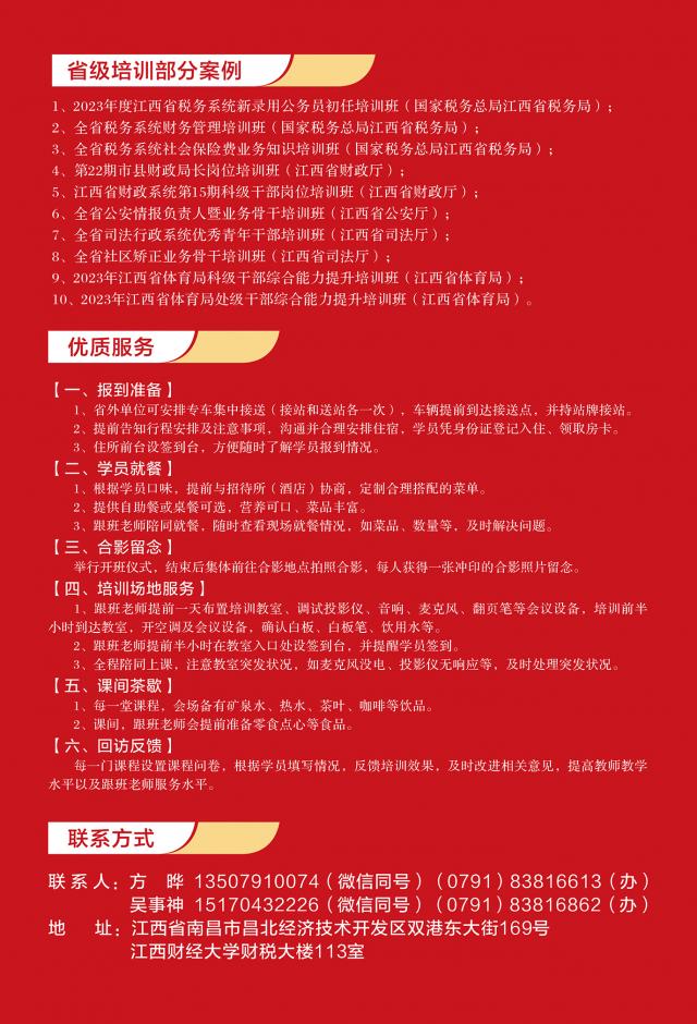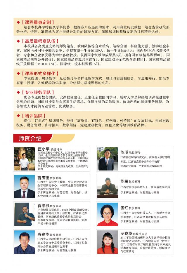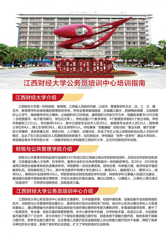 91直播 公务员培训中心坐落在交通便利、办学底蕴深厚、校园环境优美、设施设备齐全的蛟桥园校区内,与财税与91直播 合署办公,是学校承办培训业务的专门机构。培训中心在充分整合学校人才资源的基础上,通过聘请省内外具有丰富实践经验与良好理论素养的专家为兼职讲师,多渠道组建师资库,集中了一批高学历、专业强、经验丰富的高素质教师。本中心教学条件优越,办学经验丰富,自成立以来,与全国各省市县开展了广泛合作,至今共举办了干部综合素质能力提升班、财政系统干部能力提升班、税务系统干部能力提升班、财务专业能力提升班、企业管理人员提升班及金融保险人员业务能力提升班共千余期,得到了各参训单位的充分肯定,取得了良好的社会效益,扩大了学校的良好社会影响。