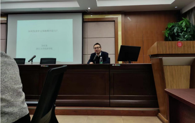 In the afternoon of November 26, Prof. Hongsheng Fang, professor, doctoral supervisor of School of Economics of Zhejiang University, and Young Changjiang Scholar of the Ministry of Education, was invited to give an academic lecture entitled How to Publish Top Chinese Journals for teachers and students of the School of Public Finance and Public Administration. Dai Lihua, vice dean of the School of Public Finance and Public Administration, presided over the lecture, and teachers Liu Hui, Xu Jianbin, He Fan and more than 30 graduate students of the Department of Finance participated in the exchange.