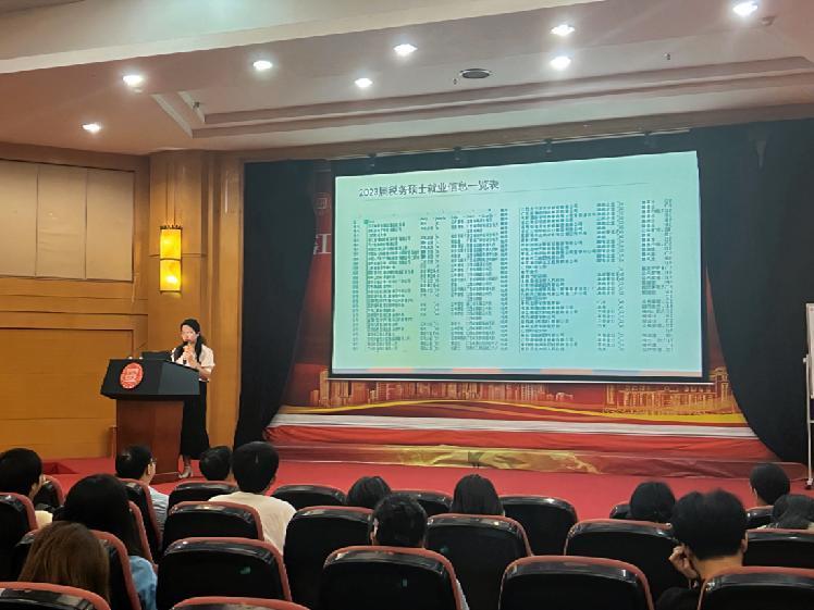 随后,学院的尹琪老师介绍了2021-2023年本科毕业生的升学、就业情况。并就考研择校和研究生就业情况与同学们进行了深入交流。关于择校,她强调选择大于努力。她鼓励同学们多思考自己考研的目的是什么,进行精准定位和择校。此外,尹老师还向同学们介绍了学院各个专业研究生的就业情况。